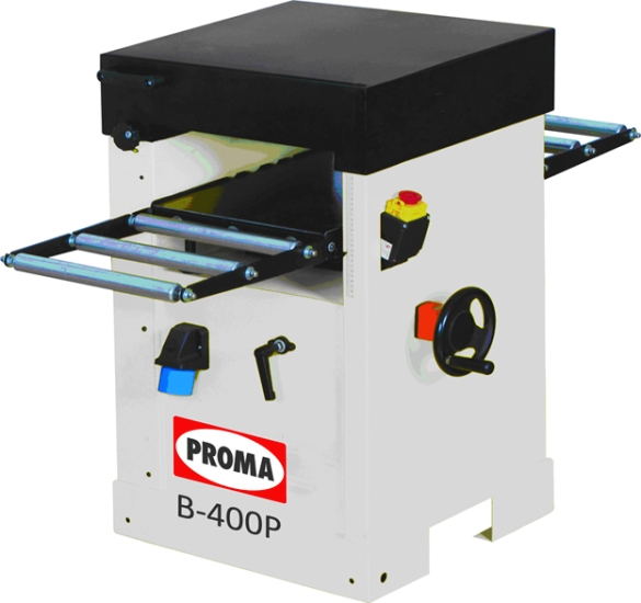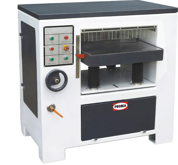 Мотор расположен внизу в тумбе и не занимает верхнюю часть корпуса, это позволило установить два металлических ролика для обратной подачи заготовок и обеспечить удобный доступ к строгальному валу для замены и регулировки ножей. В штатной комплектации установлен барабан с тремя прямыми лезвиями. Для интенсивной эксплуатации, при частой работе с твердыми и свилеватыми породами, при повышенных требованиях к качеству обработки рекомендуется приобрести и установить вал helical, имеющий 75 четырехсторонних твердосплавных сегмента с радиусной режущей кромкой.